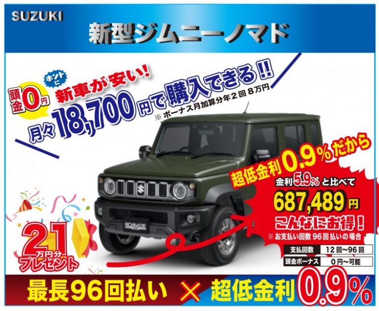 【限定5台】固定金利0.9%で、新型ジムニーノマドを。