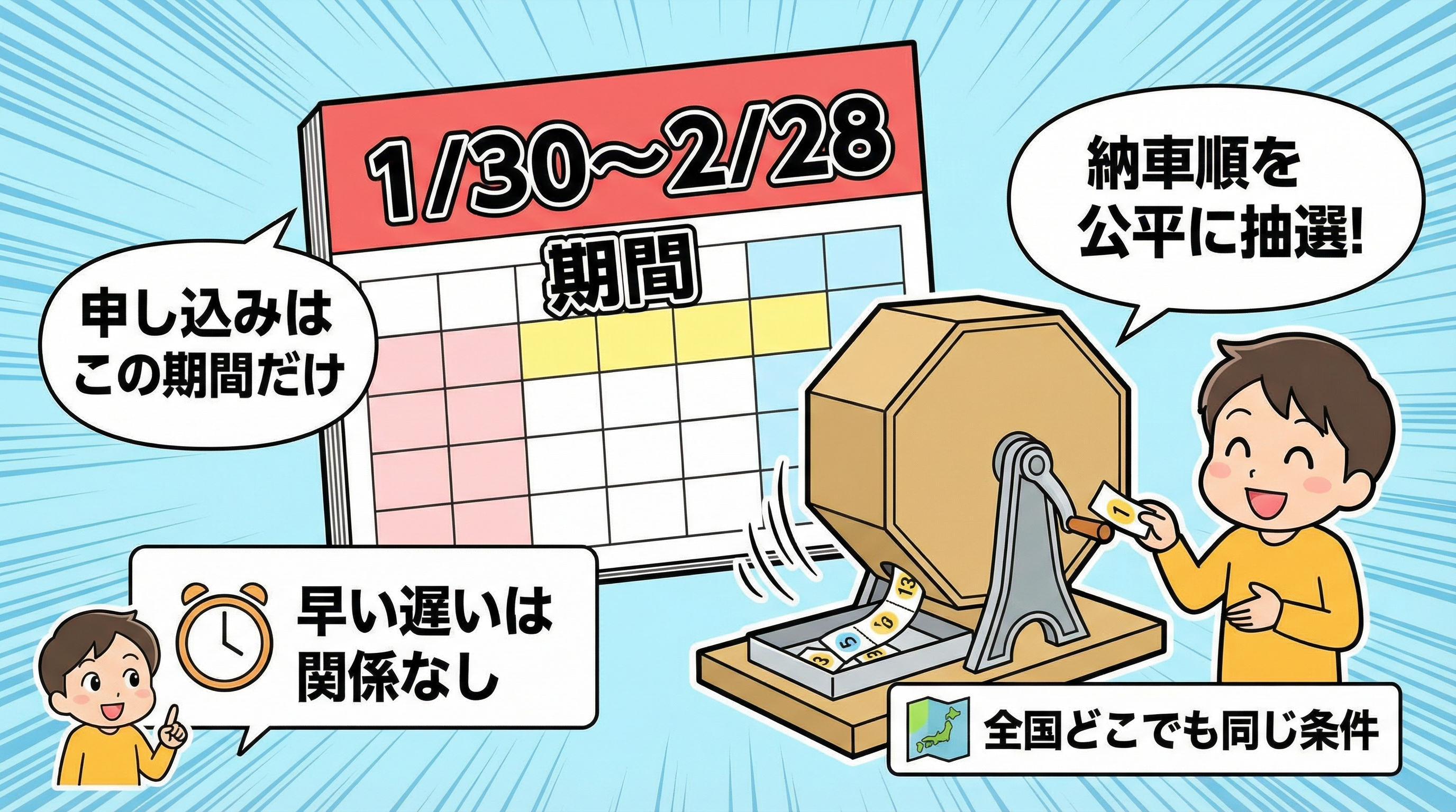 早く申し込んでも、最終日に申し込んでも当選確率は同じです。