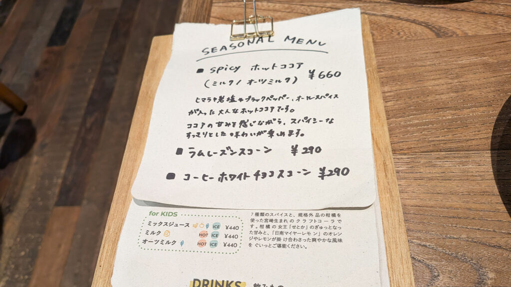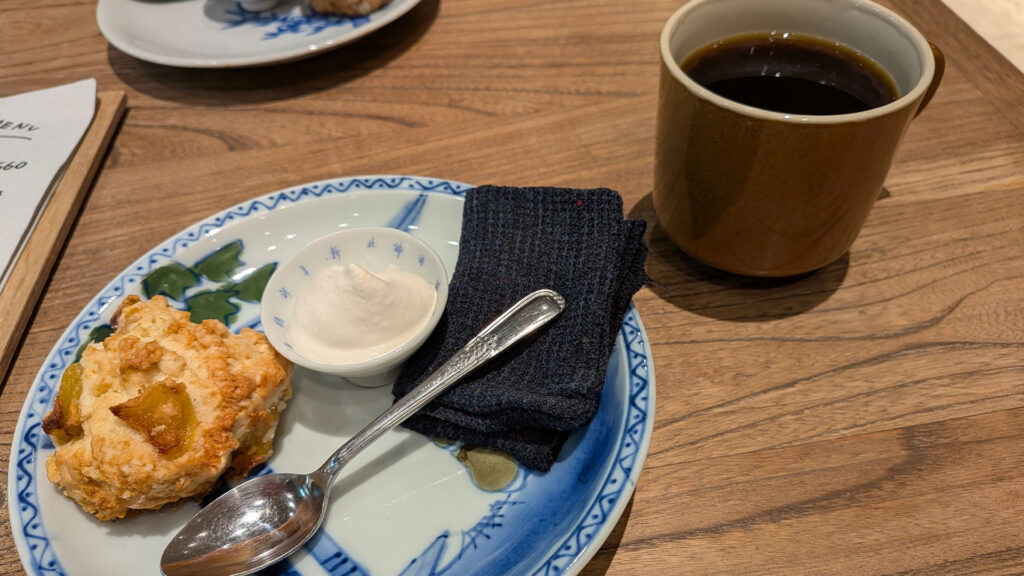 古材を使ったテーブルや椅子に座って、コーヒーとスコーンを味わっていると、時間の流れが少しゆっくりになるような感覚があります。
