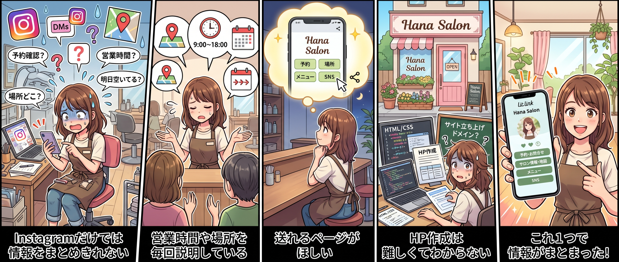 InstagramやLINEだけでは伝わらない情報を、写真・地図・サービス内容・料金・SNS導線まで、1ページにわかりやすく整理。